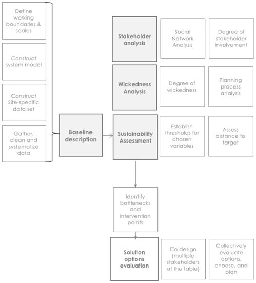 The method consists of four ‘building blocks’: (1) A thorough understanding of baseline conditions, which are then assessed under three different but converging perspectives: (2) Sustainability Assessment (SA), (3) Stakeholder Analysis and (4) Wickedness Analysis (WA). Blocks 1 and 2 are consecutive, i.e., number one is needed to perform number two. Blocks 3 and 4 are carried out separately. The assessment is made more thorough and comprehensive by bringing in the specific knowledge of each building block. This facilitates the understanding of bottlenecks and pathways towards sustainability, and as a final outcome, makes it possible to envision and evaluate solution options (Figure 1).