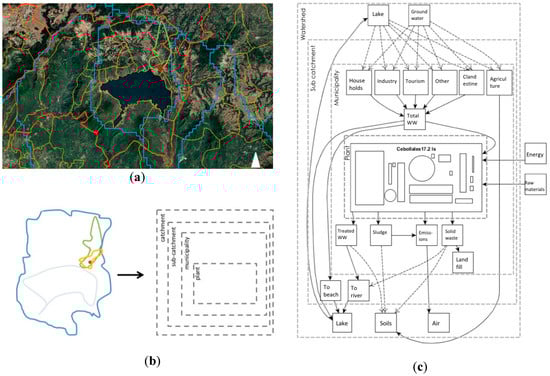 (a) A first boundary explorations map for the Panajachel case, showing different scales of analysis that were initially found to be of interest: the plant scale (red dot), the subcatchment (light green), the municipality (yellow), the watershed (blue) and the province (orange). The large water body in the center is the Atitlan Lake. (b) The abstraction of “real-world” boundaries into boundaries for the modeling process. (c) The system model for the Panajachel case, showing the systems components in the scale they (mostly) operate in.