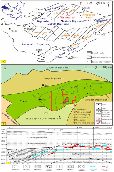 The location of the study area and an overview map of the Tarim Basin. (a) Tectonic components of the Tarim Basin, including three uplifts and four depressions with east–west orientations (modified from [17]). The Tahe oilfield is located in the Northern Uplift of the Tarim Basin. (b) The study area is in the center of the Tahe oilfield, which is located in the southwestern part of the Akekule Arch in the Northern Uplift of the Tarim Basin (modified from [18]). (c) Cross Section A-A’, showing the paleokarst system of the Tahe Oilfield. The main reservoirs are located in the northern part of the Tahe Oilfield in the Yingshan Formation (O1–2 years), which is at depths exceeding 5500 m (modified from [2]). See Figure 1b for the cross-section location.