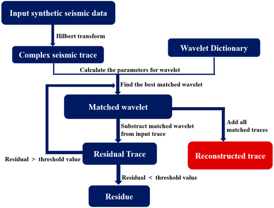 Castagna and S. Sun summarized the flow of MPD as follows [66] (shown in Figure 2). The wavelet dictionary is cross-correlated with the seismic trace, and then the projection of the best-correlated wavelet on the seismic trace is subtracted from the seismic trace. The wavelet dictionary is then cross-correlated with the residual, and the best-correlated wavelet projection is subtracted again. This process is iteratively repeated until the energy of the residual falls below an acceptable threshold. The process will converge as long as the wavelet dictionary satisfies the simple admissibility condition. The output is a list of wavelets with their respective arrival times and amplitudes. With the superposition of wavelet spectra, the wavelet list can be easily converted to a time-frequency analysis.