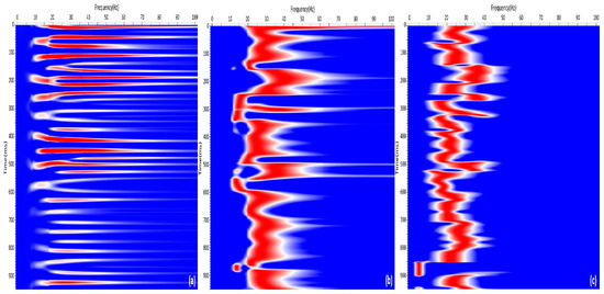 The comparison of time-frequency spectra of a synthetic seismic trace. From left to right, the method used is (a) Continuous Wavelet Transform (CWT), (b) S-Transform (ST), and (c) Matching Pursuit (MP), respectively.