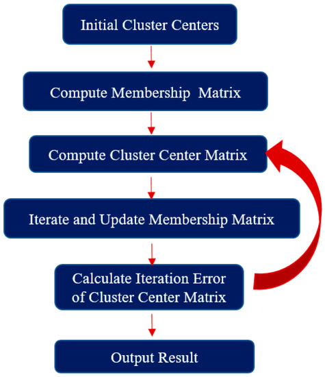 where is the fuzzy partition matrix and is the membership coefficient of the jth object in the ith cluster; is the cluster prototype (mean or center) matrix; is the fuzzification parameter and usually is set to 2; and is the distance measure between and , for instance, the Euclidean norm distance function. The basic flow of the fuzzy C-means cluster for the waveform is as follows (shown in Figure 4):