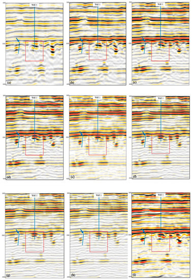 Seismic sections of different single-frequency data around Well 1. (a)–(d) represent 15 Hz, 20 Hz, 25 Hz, and 30 Hz, respectively. (e) represents 35 Hz. (f)–(h) represent 40 Hz, 45 Hz, 50 Hz, and 55 Hz, respectively. (i) represents the original full-band seismic section.