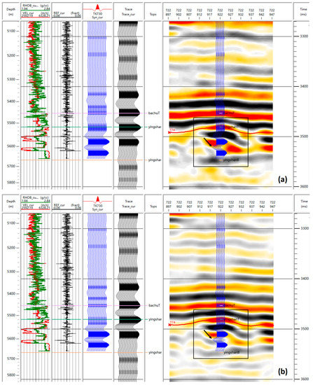 The results from Figure 6 reveal that, in the black square frame, the well-side seismic traces in Figure 6b are highly consistent with the synthetic traces (look at the black arrow), and the caves (“bead” shape) in the target layer are distinguishable. The well-side seismic traces in Figure 6a are less consistent with the synthetic traces (look at the black arrow), the “beads” are not easy to distinguish, and the lateral continuity is poor. In terms of priority illumination, seismic events of the reservoir are preferentially illuminated by certain frequency components [49]. This well-constrained result further verifies that the 35 Hz single-frequency data volume can be used as the real reservoir response to characterize the distribution of the reservoir.