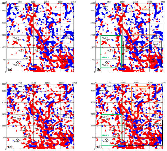 - The connectivity between wells is much better, such as the connection between Well 1, Well 2, and Well 3 in Block 1, and Well 4, Well 5, and Well 6 in Block 2. The river connectivity in Block 3 is significantly improved and the river width is widened. Previous studies on the karst development [2,3,14,46,88] and the actual drilling process show that Well 1 and Well 2 have a certain degree of connectivity (Figure 7d), which is not shown in the clustering results of the full-band data (Figure 7b). The near-shore karst platform and gentle karst slopes of the ancient channel were formed by strong hydrodynamic erosion, which can easily form a pipeline system “crossing the mountain”. The pipeline system is less damaged by the filling in the later stage, and the formed oil and gas reservoirs are larger. An increase in the connectivity of the paleo-channel may indicate a corresponding increase in reservoir connectivity.