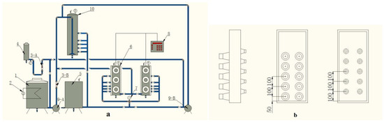 (a) Schematic of the ultrasound/chlorination water treatment system (1. Raw water container; 2. Heating equipment; 3A,B. Rotameter; 4. Chemical disinfectant container; 5. Treated water container; 6. Ultrasound (US) reactor; 7. Sample outlet; 8. Ultrasound (US) control board; 9A,B. Pump; 10. Chlorination reactor); (b) Scheme of the ultrasonic reactor [27].