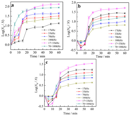 The effects of US treatment alone on the inactivation ratios of three bacteria were investigated. For US treatment alone, the simulated water sample was delivered into the ultrasonic reactor at flow rate 30 L/h from the untreated water container by centrifugal pump, and then the disinfection processes were carried out at different single frequencies (namely, 17 kHz, 33 kHz, 70 kHz, and 100 kHz) and dual-frequencies (17 + 33 kHz, 70 + 100 kHz), respectively. Samples of 100 mL were taken from the ultrasonic reactor exit during US treatments of different periods of time (t = 5, 10, 15, 20, 30, 40, 50, 60 min) and then analyzed by the plate counting method with a nutrient agar plate. A series of experiments were carried out at the power density of 20 W/L.