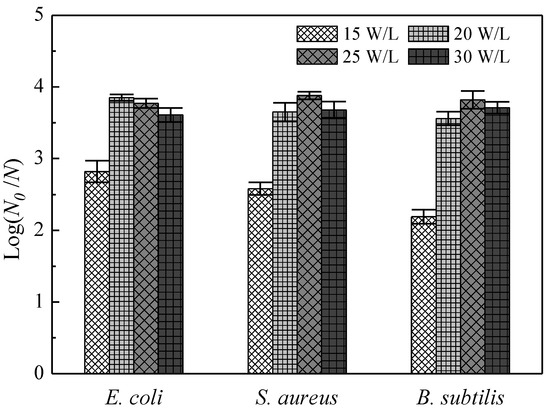 The inactivation ratios of E. coli, S. aureus, and B. subtilis in combining 10 min NaClO disinfection with US pretreatment with different input power density were tested. The testing results are displayed in Figure 4. The results indicated that the log inactivation ratios were the lowest with US pretreatment at an input power density of 15 W/L. This was due to the fact that bacterial aggregates could not be completely dispersed or broken in a short period of time with a lower US input power density. Thus, as US input power density increased, the inactivation effect was remarkably improved under the same reaction time (p < 0.05). However, when US input power density increased from 20 W/L to 30 W/L, the disinfection efficiency of the three bacteria did not change significantly (p > 0.05). This was likely due to the fact that the cavitation bubbles grew too large to be timely compressed to collapse under a larger US input power density, resulting in a weaker cavitation effect; moreover, a large number of cavitation bubbles were generated, which resulted in the fact that acoustic scattering attenuation was enhanced, and the effective utilization rate of sound waves was reduced. Thus, when US pretreatment input power density was 20 W/L, it could not only guarantee the disinfection effect, but also saved power consumption and cost. In the subsequent experiments, the power density of 20 W/L was selected as the test condition.