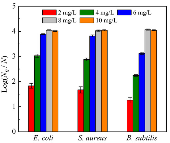 Each sample was carried out in triplicate, and their average value was used as the final result. The inactivation ratio took the form of log(N0/N), where N0 denotes the quantity of available microorganism before the disinfection treatment.