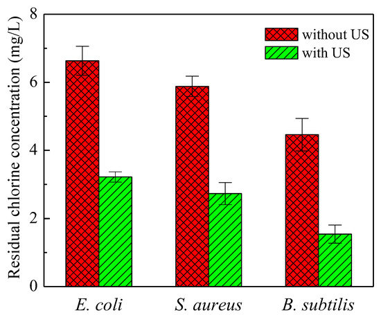 The effects of chlorine dosages on disinfection efficiencies of the three bacteria were also investigated in this study. Figure 5 shows the inactivation ratios of E. coli, S. aureus, and B. subtilis (NaClO disinfection of 30 min) at different NaClO dosages. Overall, the inactivation effects were obviously enhanced with the increase in NaClO dosage (p < 0.05). For E. coli and S. aureus, the log reduction reached up to 4 with the NaClO dosage of 6 mg/L. However, the NaClO dosage of 8 mg/L was required to achieve a 4 log reduction for B. subtilis. The reason for this was that B. subtilis could form spores to protect itself, resulting in the increase in the dosage of chlorine required. Thus, the concentration of residual chlorine (after 30 min NaClO disinfection) at 8 mg/L NaClO was determined and then compared with the control group (chlorine disinfection alone). The results are shown in Figure 6. As can be seen from the figure, the residual chlorine concentration in treated water could satisfy the requirements of the Chinese national standard GB 5749-2006 (below 4 mg/L) (the health-based guideline value recommended by the WHO is 5 mg/L [29]) with 17 + 33 kHz dual-frequency US pretreatment. Furthermore, the effective utilization rate of disinfectant was obviously improved compared with that of the control group (p < 0.05). In summary, the optimum disinfection operation is 17 + 33 kHz dual-frequency US pretreatment with 8 mg/L NaClO at 20 W/L.