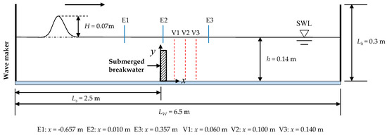 The CPM model is used to study the experimental case of solitary wave interaction with a submerged bottom-mounted breakwater in Wu et al. [15]. Figure 1 is the schematic view of this example, in which the length of the wave flume is 6.5 m, the water depth h = 0.14 m and the rectangular structure (dimension 0.1 m × 0.02 m) located 2.5 m from the home position of the wave maker. Wu’s experimental study was conducted in the wave flume at Tainan Hydraulics Laboratory, National Cheng Kung University. Wave heights at E1 (x = −0.657 m), E2 (x = 0.010 m) and E3 (x = 0.357 m) were measured by wave gauges. The wave profile and velocity filed in a certain area at the leeward of the breakwater were measured by a PIV system. The solitary wave was produced by a translational wave maker, whose motion was generated by the procedure presented in Goring [37]. In CPM simulations, stationary particles of initial particle distance L0 = 0.0025 m are generated in the whole domain. Using the approach introduced in Section 2.3 to move the wave maker in the described way, a solitary wave can be produced. A fixed time step ∆t = 0.0005 s is adopted to satisfy the Courant condition. The CPM results of wave elevations at E1, E2 and E3, wave profiles and wave velocities at three sections (V1-x = 0.06 m, V2-x = 0.10 m and V3-x = 0.14 m, as shown in Figure 1) are compared with the experimental results of Wu et al. [15].