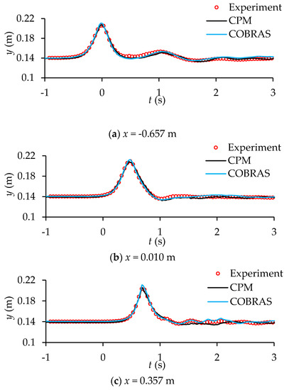 The wavemaker generates a solitary wave of wave height of H = 0.07 m, which propagates forward. The wave elevations just in front of (E1), at the location of (E2) and just behind of (E3) the breakwater is presented in Figure 2. The time when the solitary wave crest occurs at E1 is t = 0 s. In general, the CPM results and the COBRAS numerical results of Wu et al. [15] match quite well and are in a good agreement with Wu’s experimental data [15]. The relative differences of these two sets of numerical wave crests against the experimental data are presented in Table 1. The maximum difference is 3.1% for COBRAS and 0.4% for CPM. Both numerical models are very accurate in predicting the wave elevations. From the next section on, the capability of CPM in reproducing the wave breaking process and tracking the particle trajectories will be demonstrated.