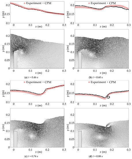 When the wave approaches the breakwater, the wave accelerates due to the blockage of part of the flume section. This leads to a jet flow toward the leeward side of the breakwater. Accompanied is a clockwise vortex behind and at an elevation near the crest of the breakwater. These phenomena can be clearly seen from the velocity profile at t = 0.46 s as shown in Figure 3a. The jet flow impinges the main water body behind the breakwater. Due to the velocity of the main water body being smaller than that of the impinging flow, the elevation of the water body is raised (see Figure 3b). The raised water body and the crest of the incoming jet flow form the double crests. This is the so-called crest-crest exchange phenomenon [15,39]. As the main crest of the solitary wave propagates downstream, the jet flow impingement increases the steepness of the tail of the transmitted wave (see the wave profile at t = 0.74 s). The impinging flow continuously reduces the water elevation of the impinging location and causes the tail surface to break in the direction opposite to that of the main wave direction (Figure 3d). In this process, the vortex develops in size and moves downstream with the wave. Specifically, the vortex occupies the area of 0.2 m × 0.1 m behind the breakwater at t = 0.88 s. It is noteworthy that the CPM model has accurately reproduced the experimental wave profiles at the time instants discussed above. And the predicted velocity distributions at sections V1, V2 and V3 are in a reasonably good agreement with the experimental results as shown in Figure 4. Although some discrepancies exist near the center of the vortex region, the numerical model is able to capture the key phenomena during this process. This shows the satisfactory accuracy of CPM.