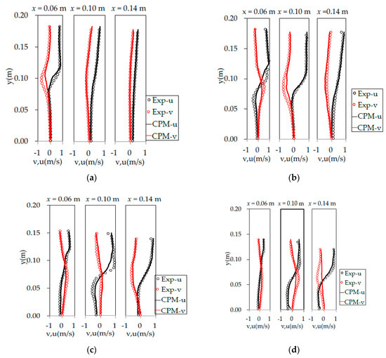 Horizontal and vertical velocity distributions at the sections of x = 0.06 m, x = 0.10 m and x = 0.14 m at typical time instants: (a) t = 0.46 s; (b) t = 0.60 s; (c) t = 0.74 s; (d) t = 0.88 s.