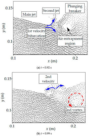 The interaction between the backward plunging breaker and the main jet flow: (a) t = 0.92 s; (b) t = 0.99 s.