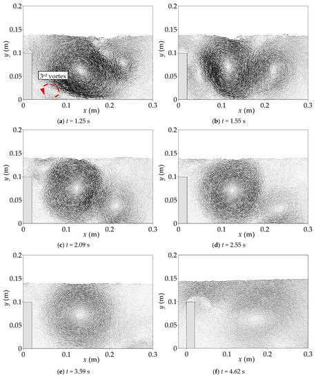The main vortex induced by the main jet flow and the second vortex initiated by the plunging breaker keep on developing after the main body of the solitary wave passes by this region. While the second vortex is rotating itself, it rotates around the main vortex, liking the movement relationship between a satellite and a planet. When the water at the leeward starts to flow back to the seaward at around t = 1.2 s (manifested in the wave elevation at E2 in Figure 2), a third vortex is initiated near the leeward toe of the breakwater (see Figure 6a). By rotating around the main vortex, this vortex subsequently goes up to the free surface (Figure 6b,c). Due to the energy dissipation induced by fluid viscosity, the third and second vortex disappear at t = 2.55 s (Figure 6d) and t = 3.59 s (Figure 6e), respectively. The backflow goes to the wave paddle and is reflected again. This new incident wave that has a much smaller amplitude pushes the remaining main vortex onshore and generates a small vortex near the crest of the breakwater at the leeward (Figure 6f). These vortexes will disappear eventually under the action of fluid viscous force.