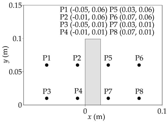 In CPM, the free surface particles are recognized by the “arc” method [35]. If any arcs of a circle around a reference particle are not covered by the circles of its neighbors, this reference particle is a free surface particle, (the reader is referred to [30] for more details). The essential boundary condition, i.e., p = 0, is enforced on the free surface particles. The impermeable walls are modeled by the mirror particle approach [26,36], i.e., generating fictitious particles outside the physical boundary by mirroring real fluid particles along the boundary line. Particularly, a moving wall can be simulated by updating the axis (in accordance with the physical wall motion) along which mirror particles are generated. This is an intrinsic advantage compared to the mesh-based methods. The submerged structure is simulated by fixed particles. On all the solid boundaries, the Neumann boundary condition is applied, where n is the outward unit vector of the solid boundary.
