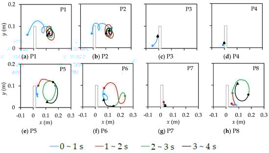Trajectories of eight particles from 0 ~ 4 s: Blue line (0 ~ 1 s), red line (1 ~ 2 s), green line (2 ~ 3 s) and black line (3 ~ 4 s)