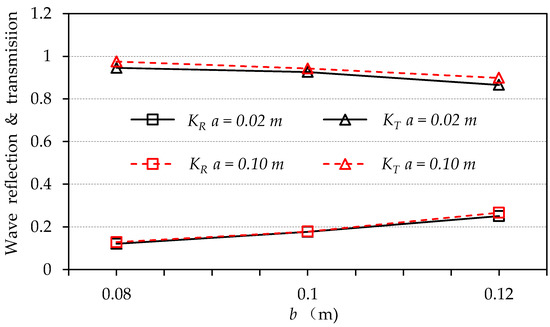 In practical applications, the dimension of a breakwater and the wave conditions are important factors that affect the effectiveness of the breakwater in preventing incident waves and dissipating wave energy. To provide some insights, this section conducts a parametric study by analyzing the wave characteristics of the abovementioned solitary wave interacting with six rectangular submerged breakwaters, whose dimensions are shown in Table 2. The wave transmission (KT) and reflection coefficients (KR) with breakwaters of different dimensions are shown in Figure 9. As can be seen, increasing the breakwater height increases the wave reflection and reduces the wave transmission, while the breakwater width has little effect on wave reflection and transmission.