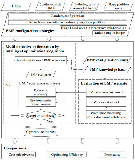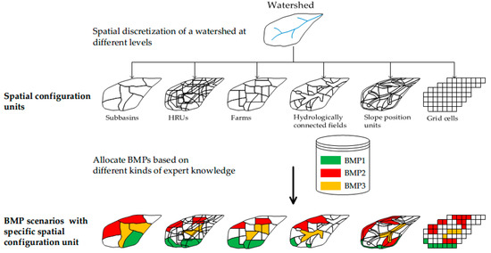 Framework comparing the effects of different BMP configuration units for the spatial optimization of watershed BMP scenarios in this study (extended from [2]).