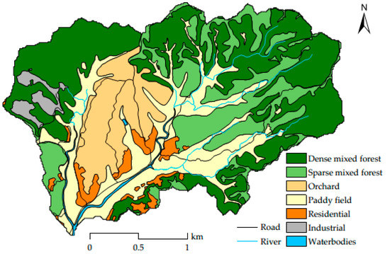 The Youwuzhen watershed (~5.39 km2), located in the typical severely eroded red-soil hilly region in southeastern China, was selected as the study area (Figure 3). Low hills with steep slopes (up to 52.9° and with an average slope of 16.8°) and broad alluvial valleys are the primary geomorphology forms [2]. Forest (59.8%), paddy field (20.6%), and orchard (12.8%) are the primary landuse types in the study area (Figure 4). Additionally, forests in the study area are dominated by secondary or human-made forests with low coverage due to the destruction of vegetation caused by soil erosion and economic development in the past [35] (Figure 4). Soil types in the study area are red soil (78.4%) and paddy soil (21.6%) which can be classified as Ultisols and Inceptisols in US Soil Taxonomy, respectively [36]. Red soil is mainly distributed in the hilly region, while paddy soil is mainly distributed in the broad alluvial valleys with a similar spatial pattern of paddy rice landuse (Figure 4). The climate belongs to the mid-subtropical monsoon moist climate with an annual average temperature of 18.3 °C. The annual average precipitation is 1697.0 mm [35].