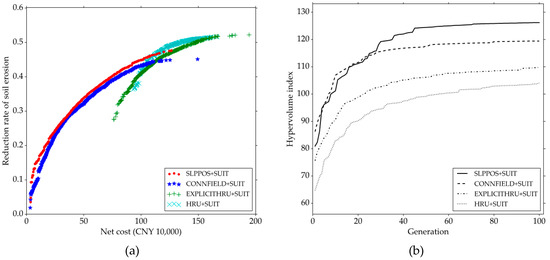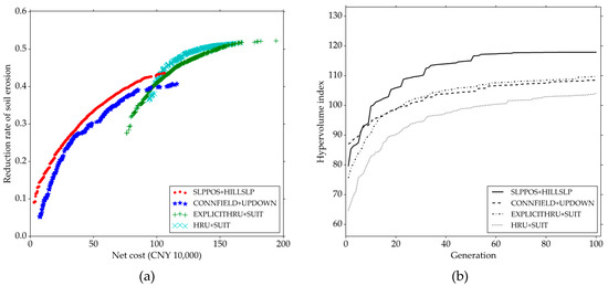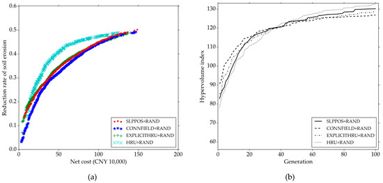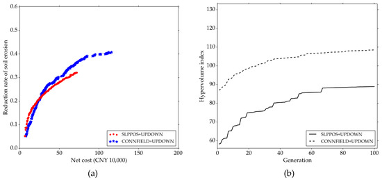 The changes of the hypervolume index with generations can provide a qualitative estimation of the optimizing efficiency. For an ideal optimization, the hypervolume index will increase rapidly at the beginning of the optimization, then increase slowly, and eventually remain stable. Therefore, the faster the hypervolume index reaches stability, the better the optimizing efficiency. For convenience and consistency of comparison, a criterion is adopted to judge whether the hypervolume index has reached stability in this study, i.e., if the increment rate of the hypervolume index compared to the former generation is lower than 0.1% for three consecutive generations and there are also no three consecutive increment rates greater than 0.1% in the following generations. For comparability in this study, the worst reference point for calculating the hypervolume index of all experiments was set to (300, 0), which represents the net cost being CNY 3 million and the reduction rate of soil erosion being zero.