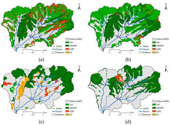 Comparison of the spatial distribution of selected BMP scenarios of the 100th generation from four types of BMP configuration units applied with the corresponding optimal strategies: (a) one HRU+SUIT scenario with a soil erosion reduction rate of 0.41 and a net cost of CNY 0.98 million; (b) one EXPLICIT+SUIT scenario with a soil erosion reduction rate of 0.40 and a net cost of CNY 0.97 million; (c) one CONNFIELD+UPDOWN scenario with a soil erosion reduction rate of 0.40 and a net cost of CNY 1.08 million; and (d) one SLPPOS+HILLSLP scenario with a soil erosion reduction rate of 0.40 and a net cost of CNY 0.78 million.