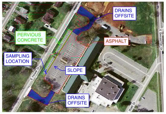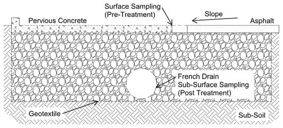 The monitoring study was conducted at the Alcoa City Center in Alcoa, TN, USA. (Figure 1). The site consists of asphalt driving lanes and parking (red text in figure) adjacent to a row of pervious concrete parking (green text in figure) on the down-gradient portion of the lot, with rock-based detention storage beneath the pervious concrete. The lot is sloped such that the majority of the runoff from the asphalt infiltrates through the pervious concrete and is temporarily stored in the underlying limestone aggregate reservoir (40% porosity) before exiting through a 38 cm (15 in) diameter perforated French drain (Figure 2). The water exiting the drain enters a vault, then discharges to the city stormwater lines via a secondary outlet pipe leading from the vault. The asphalt entrance and exit drain offsite through unrelated outlets.