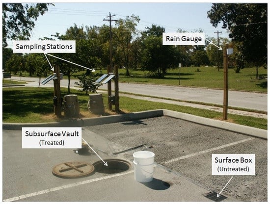 Two solar powered sampling stations were installed adjacent to the parking area to collect samples of the untreated asphalt runoff and the treated pervious concrete discharge (Figure 3). Float switches were installed in both the runoff collection box and the outlet end of the French drain, each triggering a Campbell Scientific (Logan, UT, USA) data logger at that sampling location. The loggers were programmed to check their float switch for the presence of water every 15 min. After detecting water, the loggers turned on ISCO (Lincoln, NE, USA) samplers and treated and untreated samples were collected every 5 min until all water was removed. Three samples (representing 15 min of stormwater) were placed into each of up to 24 sample bottles, such that a 6-h event could be fully sampled. A Texas Electronics (Dallas, TX, USA) tipping bucket rain gauge connected to the surface data logger recorded the precipitation depth every 15 min.