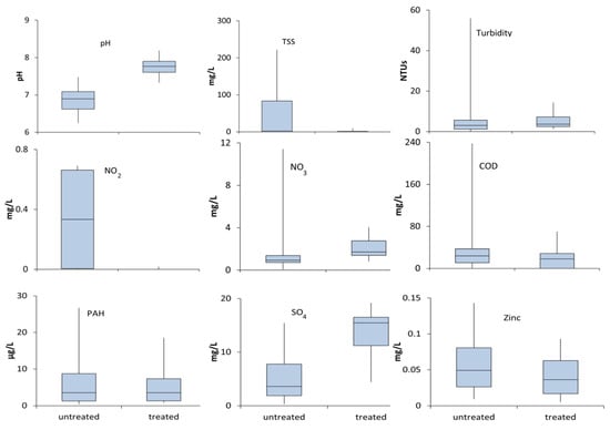 The paired samples (untreated versus treated) for each of the nine water quality parameters measured are plotted in Figure 4, which displays box and whisker plots of the treated and untreated samples.