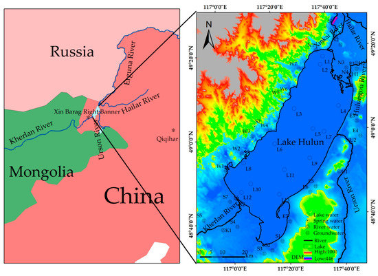 Previous research on Hulun’s lake water has primarily utilized the balance model for meteorological and hydrological data [8,9]. The main problem with such model is that it is not straightforward to determine the equilibrium items. Also, the Lake Hulun Basin, which shares borders with Russia and Mongolia, has a complex water system. For instance, the basin connects the Krulun River, which originates in Mongolia to the south, and the Erguna River which demarcates the China-Russia border to the north. The lake’s unique geographical location and natural environment make it an important place for ecotourism, fisheries and scientific research. The combination of hydrogen and oxygen isotopes and chloride ions can effectively reduce the uncertainty caused by a single research method. Hence for this study, the water from Lake Hulun and its surrounding groundwater, springs and major inflowing rivers were sampled in April 2017 (frozen period) and July 2017 (non-frozen period). A comparative analysis was conducted to investigate the variations in the hydrogen and oxygen isotope and chloride ion content in each type of water during the two periods (frozen and non-frozen). Revealing the hydrogen-oxygen isotope and chloride ion cycle between the water cycles in each water body and its influencing factors, along with the recharge relationship between the lake water and groundwater. The study’s findings have important implications for the sustainable exploitation and utilization of water resources and policymaking for water resource conservation in the Lake Hulun Basin.