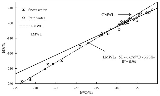 Due to the different origins, types and degrees of isotopic fractionation in the precipitation, there are inevitably discrepancies in terms of the slopes and intercepts between the GMWL and LMWL for a specific region. It is therefore important to establish the LMWL before any investigation of the isotopic characteristics in a region is conducted. Based on an analysis of the hydrogen and oxygen isotopes in the local precipitation from June 2016 to September 2017, the snow water’s δD ranges from −253‰ to −184‰, the δ18O value ranges from −33.4‰ to −23.6‰, the δD of the rainwater ranges from −137‰ to −16‰ and the δ18O value ranges from −19.1‰ to −1.3‰. Based on this data, a weighted average of the hydrogen and oxygen isotope in rainwater can now be calculated and the LMWL in the Lake Hulun area determined (Figure 2). The equation for LMWL in the study area is therefore defined as follows: