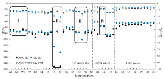The results of the stable isotope analysis are shown in Table 1 and indicate that the δD values recorded in the lake water ranged from −84.5‰ to −63.2‰ and the δ18O values ranged from −9.9‰ to −6.1‰, while for spring water these ranged from −103.3‰ to −89.1‰ and from −12.9‰ to −10.9‰, respectively. In the river water, the δD values ranged from −110‰ to −62‰ and the δ18O values from −13.9‰ to −5.2‰; the δD values in the well water ranged from −211‰ to −100‰ and the δ18O values ranged from −27.6‰ to −8.4‰. Table 1 shows that the evaporation intensity for each type of water during the frozen period is lower than that during the non-frozen period. As the variation of hydrogen and oxygen isotopes in water bodies is influenced by evaporative fractionation [17]. Among them, the δD values and the δ18O values of lake water passed the Rank sum test of p < 0.01 (n = 13), and the groundwater (including two springs water) passed the Student’s t-test of p < 0.01 (n = 27). The Student’s t-test of the δD values and the δ18O values of river water were p = 0.252 and p = 0.249 (n = 7), respectively. This was attributed to the small number of river water samples which came from four different. In April, when the lake is frozen, the temperature falls below zero degree Celsius in the Lake Hulun Basin and the surface water is covered with ice, which greatly reduces the water evaporation and interferes with the normal evaporative fractionation of the water body. In contrast, in July the water evaporates under the influence of the relatively high temperatures in the region, resulting in a significantly higher accumulation of heavy isotopes in the lake, spring and river water than in the groundwater.