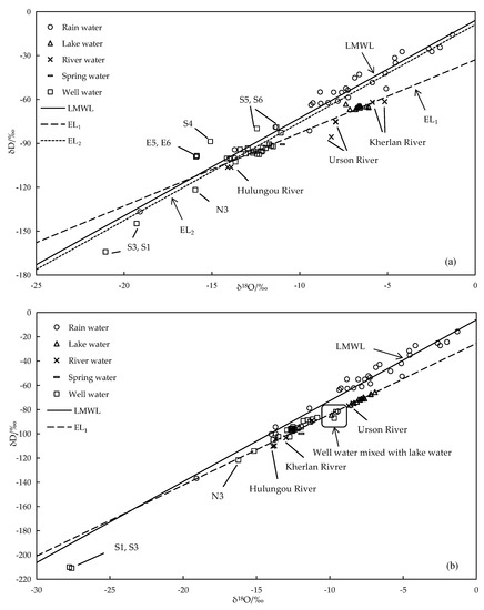 The relationships between the hydrogen and oxygen isotopes in precipitation, water, river, well and spring in the Lake Hulun area during the non-frozen period are shown in Figure 4a. Although the values of δD and δ18O in the lake and river water both fall below the LMWL, the values of δD and δ18O for the lake water are more stable and intense than that of those for the river water. This suggests that the wide lake surface of Lake Hulun is subject to strong evaporation, leading to excessive fractionation of the isotopes. It accords with the fact that Lake Hulun is located in an arid/ semi-arid area where evaporation is greater than precipitation. The following EL1 equation for the evaporation trend line for the Lake Hulun area is thus obtained through a regression analysis of the hydrogen and oxygen isotope levels in the lake and its inflowing rivers.