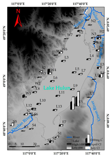 Distribution of Cl− concentrations in water bodies in the Lake Hulun area during frozen and non-frozen periods.
