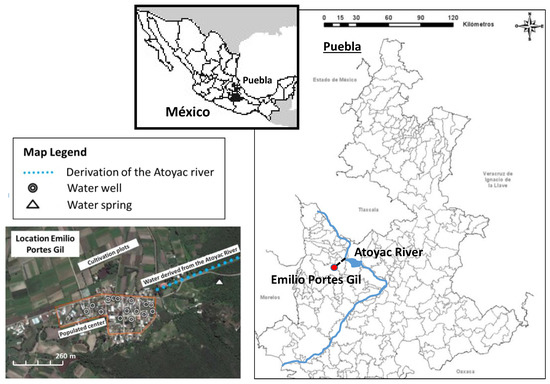 The study area, known as Emilio Portes Gil (EPG), belongs to the municipality of Ocoyucan, one of the 217 municipalities of the State of Puebla in Mexico. EPG is an ejidal colony of 522 inhabitants, whose main economic activity is agriculture [43,46] (Figure 1).