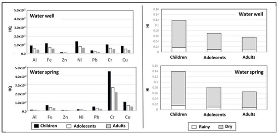 The risk of noncancerous diseases due to the chronic ingestion of heavy metals present in spring water and wells is greater for children than for adults (Table 3 and Table 4, Figure 2). This is evidenced by the values of the hazard quotients (HQ), as well as in the hazard indices (HI).