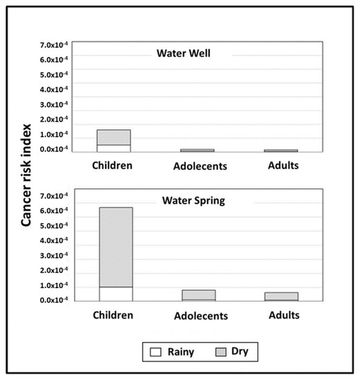 Table 5 and Figure 3 show that the risk of carcinogenic diseases is greater due to the prolonged intake of water from the spring, compared to the water in the wells, particularly for children, which is explained by the presence of higher concentrations of lead and chromium in this source of water. These risks are accentuated in the dry season, mainly in the subgroup of children. The CRI (cancer risk index) obtained for the subgroup of children with spring water showed a value that can be considered critical.