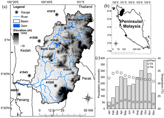 (a) Muda River Basin, (b) Peninsular Malaysia, and (c) the climatology of precipitation, maximum and minimum temperature from 1985 to 2015.