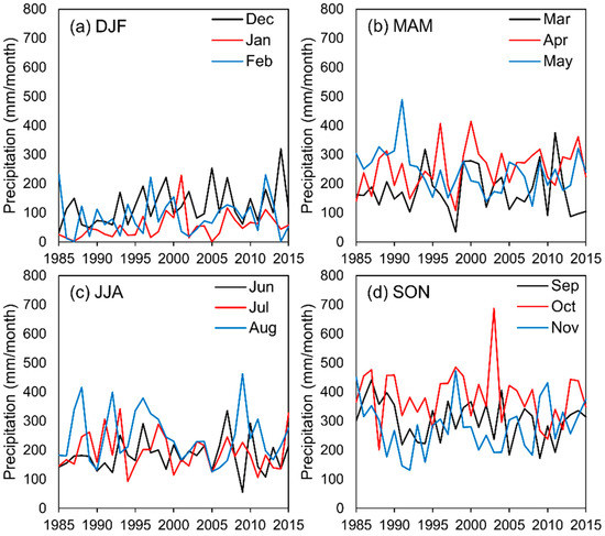 Temporal trends of monthly precipitation of the Muda River Basin in (a) December–January–February (DJF), (b) March–April–May (MAM), (c) June–July–August (JJA), and (d) September–October–November (SON) seasons from 1985 to 2015.