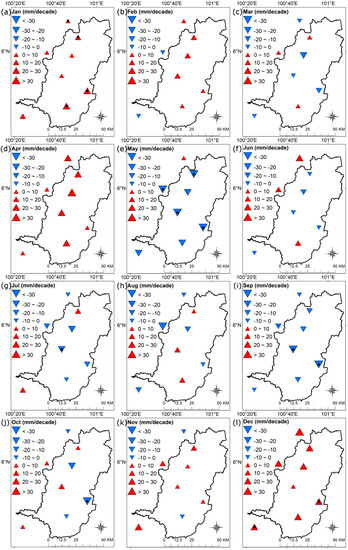 A significant increasing trend of monthly precipitation was found in January and December at a 95% significance level, with changing rates of 17.01 mm/decade and 23.23 mm/decade, respectively. Interestingly, monthly precipitation tended to increase in the low precipitation season in the MRB. For example, Figure 3a shows 50% of the stations had a significant increasing trend in January, the month that received lowest amount of monthly precipitation of the basin, at a 95% significance level. Similarly, most of the stations within the basin showed an increasing trend in monthly precipitation in November, December, February, and April. A possible explanation for the increases of monthly precipitation during these months might be due to a warmer condition in Peninsular Malaysia in the past few decades [29]. Higher temperature increased the water vapor in atmosphere and then, amplified the local convection processes [30]. Therefore, more intense precipitation has been occurred in these periods.