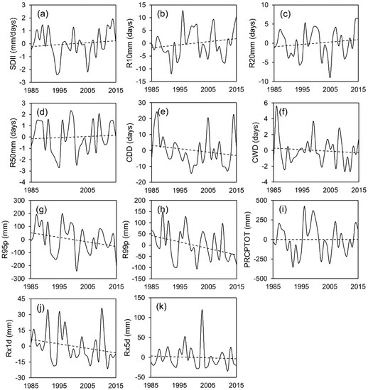 Regionally averaged anomaly of various precipitation extremes over the Muda River Basin from 1985 to 2015, (a) SDII; (b) R10mm; (c) R20mm; (d) R50mm; (e) CDD; (f) CWD; (g) R95p; (h) R99p; (i) PRCPTOT; (j) Rx1d; (k) Rx5d.