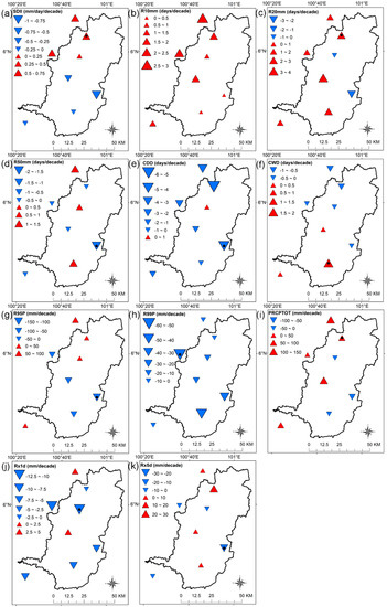 - Regional annual R10mm, R20mm, R50mm, and CWD showed increasing trends from 1985 to 2015, with magnitude changes of 1.02, 0.59, 0.13, and 0.1 days/decade, respectively. By contrast, decreasing trends were found in CDD (2.69 days/decade), R95p (39.76 mm/decade), R99p (32.37 mm/decade), Rx1d (4.21 mm/decade), and Rx5d (2.5 mm/decade).