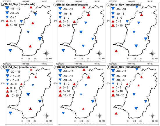 Trend for regionally averaged Rx1d and Rx5d indices over the Muda River Basin during 1985–2015. Dotted indicates significant trend at a 95% significance level. (a) Rx1d–September; (b) Rx1d–October; (c) Rx1d–November; (d) Rx5d–September; (e) Rx5d–October; (f) Rx5d–November.