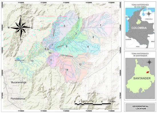 Geographical location of the Tona watershed. Right panels show in red the location of the watershed within the Country and the State. Left area shows the location of the watershed, the Tona river’s main tributaries, and the location of the new reservoir, at the lowest elevations of the watershed. Texts indicate the location of two of the cities that benefit from the Tona river’s water (Bucaramanga and Floridablanca). The numbers and different colors represent a subwatershed division for the study area. The coordinate system corresponds to the local projection for the site (MAGNA Colombia Bogotá—EPSG: 3116).