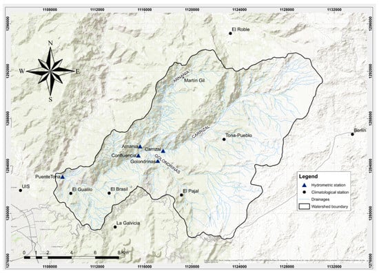 The Tona watershed is situated in the northeast side of Colombia with its headwaters located within the western limits of the Berlín–Santurbán páramo ecosystem, reaching elevations of up to 3850 m.a.s.l. Despite its small size (192.5 km2), this watershed plays an important role on the provision of water for the metropolitan area of Bucaramanga (1,142,000 inhabitants), currently contributing approximately 55% of the resource handled by the main water company, the Metropolitan Aqueduct of Bucaramanga, AMB (Acueducto Metropolitano de Bucaramanga), with an expanded service expected by the end of 2019 after the construction of the Bucaramanga Reservoir and associated conveyance infrastructure (regulation of additional 1200 lps). The watershed has three main drainages (Arnania, Carrizal, and Golondrinas), which form the Tona River in the lower part of the basin (see Figure 1).