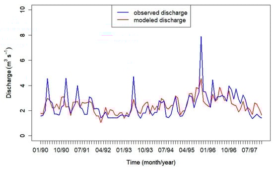 Observed (blue) vs. modeled (red) monthly discharge data at the Puente Tona station for the calibrated model.