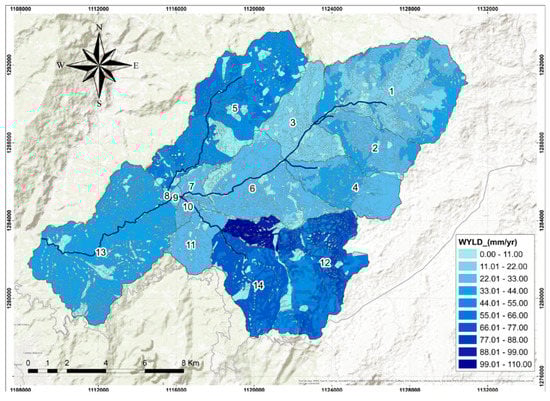 Average annual water yield in the Tona watershed (mm year−1) by the hydrologic response unit (HRU).