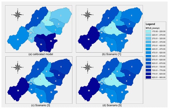 Average annual water yield by subwatershed under future climate RCP 4.5: (a) water yield for the calibrated model, (b) water yield for Scenario {1}, (c) water yield for Scenario {3}, and (d) water yield for Scenario {5}.