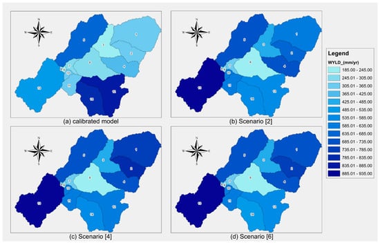 Average annual water yield by subwatershed under future climate RCP 8.5: (a) water yield for the calibrated model, (b) water yield for Scenario {2}, (c) water yield for Scenario {4}, and (d) water yield for Scenario {6}.